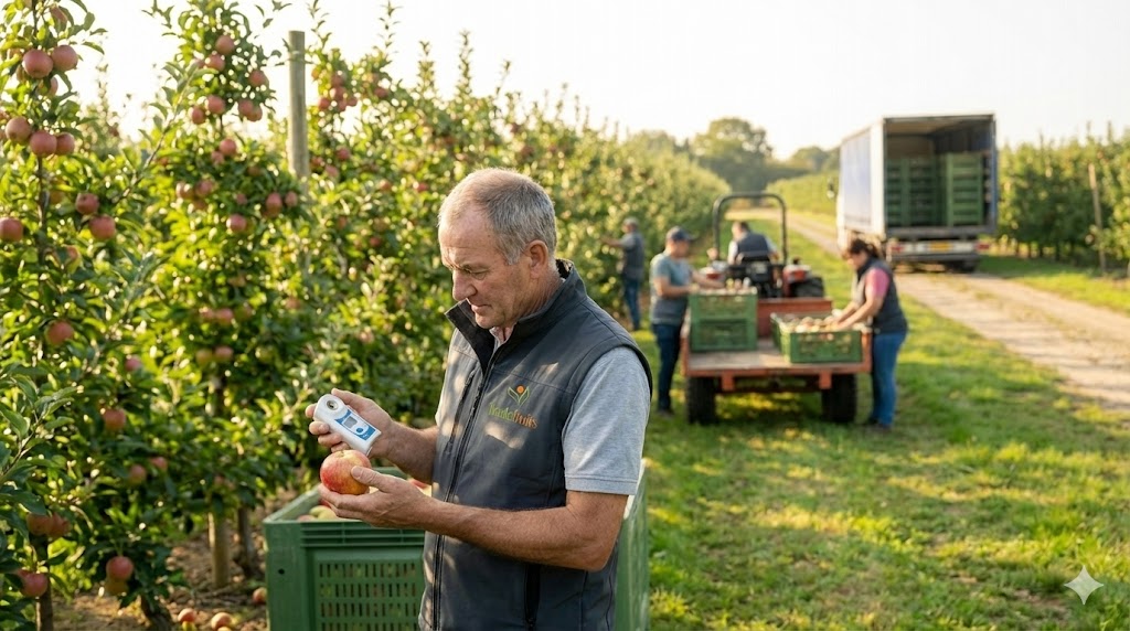 3. Inspeção Técnica: Avaliamos os parâmetros cruciais para o seu negócio — Brix (doçura), calibre, coloração e firmeza — antes mesmo de fechar o negócio.